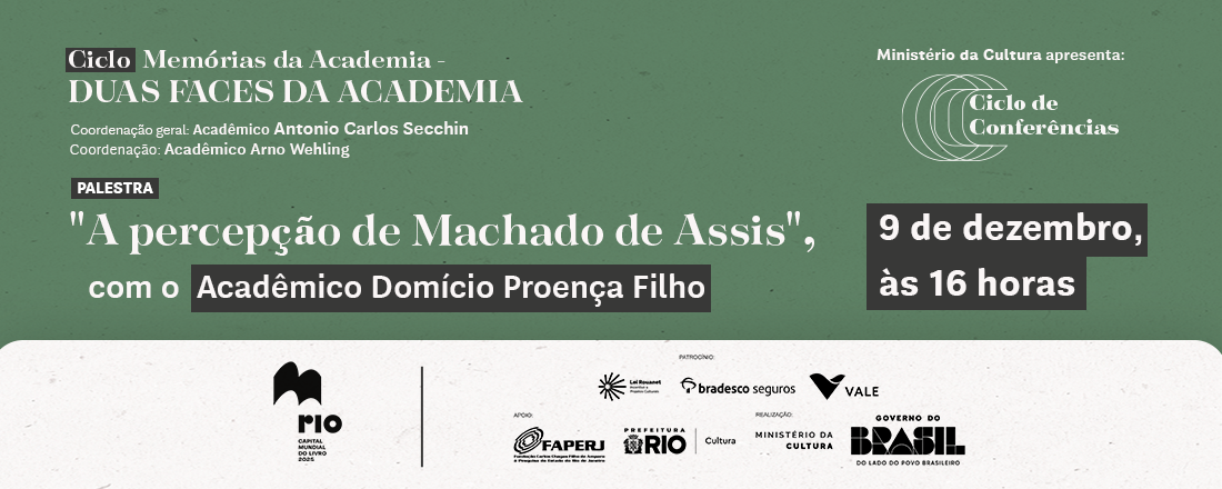 O Acadêmico e escritor Domício Proença Filho falará sobre "A percepção de Machado de Assis", segunda e última conferência do ciclo "Memórias da Academia" na terça-feira, 9 de dezembro, às 16h.